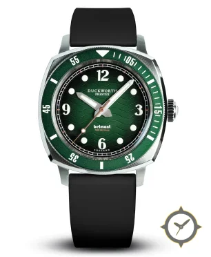 Eine Taucheruhr-Uhr mit einem 35.5mm Gehäuse im Vintage-Stil gefertigt aus Edelstahl mit einem Zifferblatt in grün und einer besonderen "wavy (wave pattern)"-Oberfläche.
