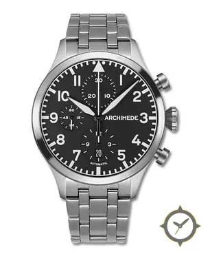 Eine Pilot-Uhr mit einem markanten 45mm Auftritt am Handgelenk, gefertigt aus Edelstahl mit einem Zifferblatt in schwarz und einer besonderen "matte"-Oberfläche.