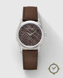 Eine Dress-Uhr mit einem 34mm Gehäuse im Vintage-Stil gefertigt aus Edelstahl mit einem Zifferblatt in braun und einer besonderen "tweed textile"-Oberfläche.