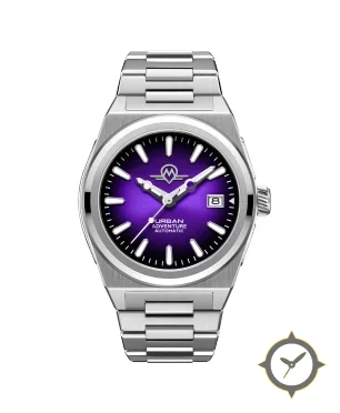 Eine Sport-Uhr mit einem markanten 43.5mm Auftritt am Handgelenk, gefertigt aus Edelstahl mit einem Zifferblatt in lila und einer besonderen "sunburst (gradient)"-Oberfläche.