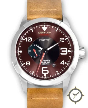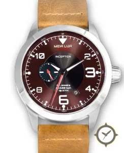 Eine Pilot-Uhr mit einem 34mm Gehäuse im Vintage-Stil gefertigt aus Edelstahl mit einem Zifferblatt in karmesinrot und einer besonderen "sunburst metallic"-Oberfläche.