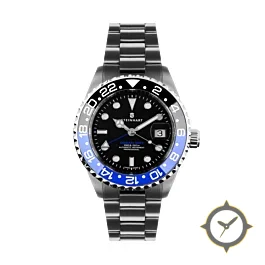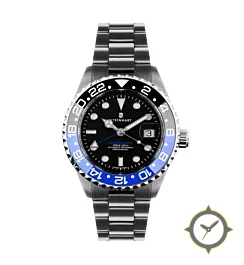 Eine GMT-Uhr mit einem 31.5mm Gehäuse im Vintage-Stil gefertigt aus Edelstahl mit einem Zifferblatt in schwarz und einer besonderen "glossy lacquer"-Oberfläche und einer echten GMT-Funktion, mit der du eine zweite Zeitzone verfolgen kannst.