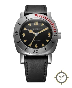 Eine Taucheruhr-Uhr mit einem markanten 46.5mm Auftritt am Handgelenk, gefertigt aus Edelstahl mit einem Zifferblatt in schwarz und einer besonderen "matte"-Oberfläche.