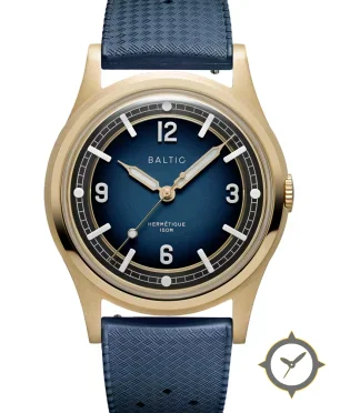 Eine Taucheruhr-Uhr mit einem 32.5mm Gehäuse im Vintage-Stil gefertigt aus Bronze mit einem Zifferblatt in blau und einer besonderen "sunburst"-Oberfläche.