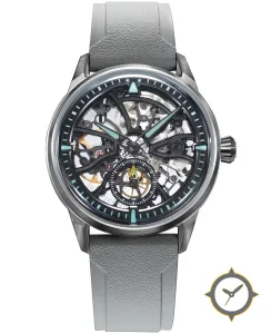 Eine Skelett-Uhr mit einem vielseitigen 40.5mm Gehäuse, das an fast jedes Handgelenk passt, gefertigt aus Edelstahl mit einem Zifferblatt in schwarz und einer besonderen "open-worked / skeletonized, exposed movement"-Oberfläche.