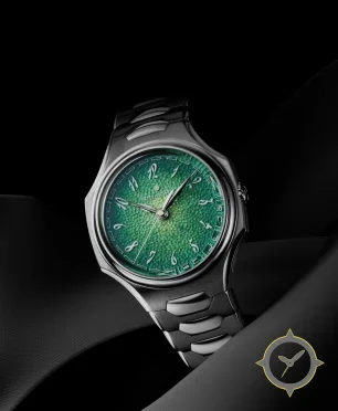 Eine Luxus-Uhr mit einem 32.5mm Gehäuse im Vintage-Stil gefertigt aus Edelstahl mit einem Zifferblatt in grün und einer besonderen "textured guilloché / scaled motif"-Oberfläche.