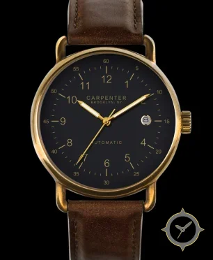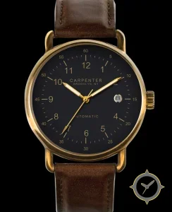 Eine Vintage-Uhr mit einem vielseitigen 39.5mm Gehäuse, das an fast jedes Handgelenk passt, gefertigt aus Messing mit einem Zifferblatt in schwarz und einer besonderen "matte"-Oberfläche.