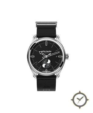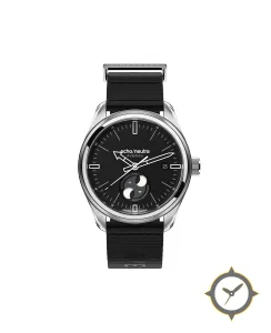 Eine Minimalistisch-Uhr mit einem 32mm Gehäuse im Vintage-Stil gefertigt aus Edelstahl mit einem Zifferblatt in schwarz und einer besonderen "matte"-Oberfläche und einer wunderschönen Mondphasenanzeige.