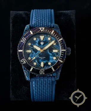 Eine Taucheruhr-Uhr gefertigt aus Edelstahl mit einem Zifferblatt in blau und einer besonderen "pearlized, marbled/wavy finish"-Oberfläche.