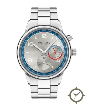 Eine Weltzeituhr-Uhr mit einem vielseitigen 40.5mm Gehäuse, das an fast jedes Handgelenk passt, gefertigt aus Edelstahl mit einem Zifferblatt in silber und einer besonderen "sunburst (radial brushed)"-Oberfläche, ideal für Weltenbummler dank der Weltzeit-Funktion.