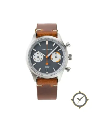 Eine Chronograph-Uhr mit einem markanten 47.5mm Auftritt am Handgelenk, gefertigt aus Edelstahl mit einem Zifferblatt in grau und einer besonderen "matte"-Oberfläche.