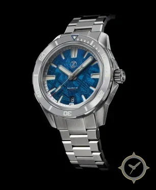 Eine Taucheruhr-Uhr mit einem vielseitigen 41mm Gehäuse, das an fast jedes Handgelenk passt, gefertigt aus Edelstahl mit einem Zifferblatt in blau und einer besonderen "meteorite-like textured finish (cross-hatched)"-Oberfläche.