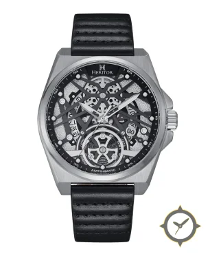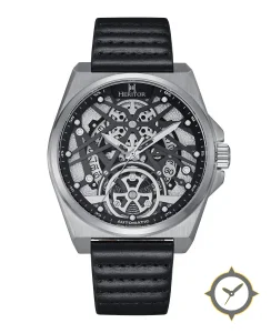 Eine Skelett-Uhr mit einem markanten 45mm Auftritt am Handgelenk, gefertigt aus Edelstahl mit einem Zifferblatt in schwarz und einer besonderen "skeletonized / open-worked"-Oberfläche.