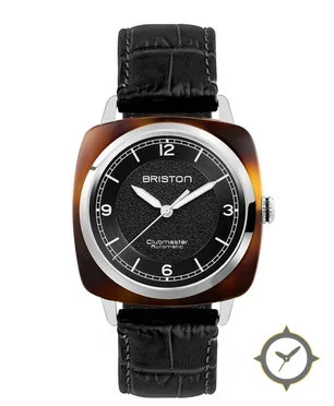 Eine Vintage-Uhr mit einem markanten 45.5mm Auftritt am Handgelenk, gefertigt aus Harz mit einem Zifferblatt in schwarz und einer besonderen "grained/pebble texture in center with smooth outer chapter ring"-Oberfläche.