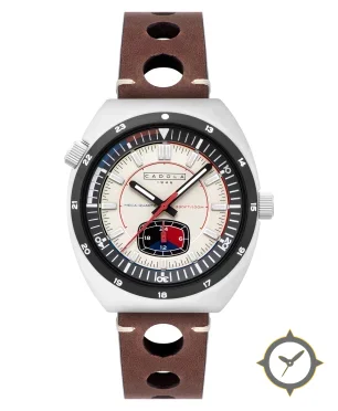 Eine GMT-Uhr mit einem markanten 41.5mm Auftritt am Handgelenk, gefertigt aus Edelstahl mit einem Zifferblatt in weiß und einer besonderen "light grained/eggshell texture"-Oberfläche und einer echten GMT-Funktion, mit der du eine zweite Zeitzone verfolgen kannst.