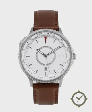 Eine Weltzeituhr-Uhr mit einem markanten 47.5mm Auftritt am Handgelenk, gefertigt aus Edelstahl mit einem Zifferblatt in weiß und einer besonderen "matte lacquer"-Oberfläche, ideal für Weltenbummler dank der Weltzeit-Funktion.
