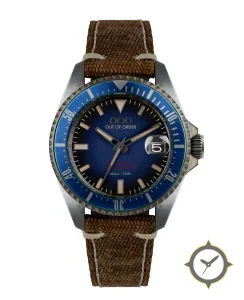 Eine Taucheruhr-Uhr mit einem vielseitigen 38.5mm Gehäuse, das an fast jedes Handgelenk passt, gefertigt aus Edelstahl mit einem Zifferblatt in blau und einer besonderen "sunburst"-Oberfläche.