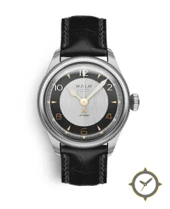 Eine Vintage-Uhr mit einem markanten 44.5mm Auftritt am Handgelenk, gefertigt aus Edelstahl mit einem Zifferblatt in schwarz und einer besonderen "vertical-brushed"-Oberfläche.