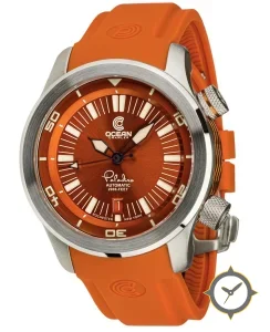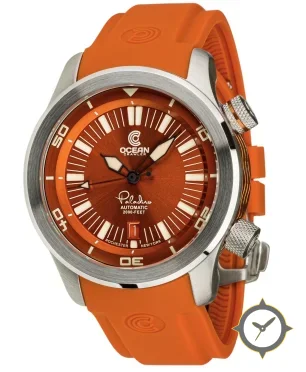 Eine Taucheruhr-Uhr mit einem 36mm Gehäuse im Vintage-Stil gefertigt aus Edelstahl mit einem Zifferblatt in orange und einer besonderen "sunburst"-Oberfläche.