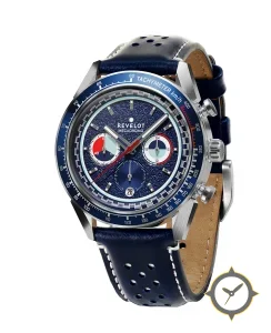 Eine Racing-Uhr mit einem 33.5mm Gehäuse im Vintage-Stil gefertigt aus Edelstahl mit einem Zifferblatt in blau und einer besonderen "grainy textured finish"-Oberfläche.
