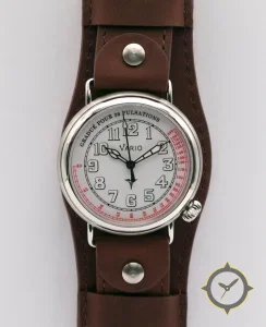 Eine Vintage-Uhr mit einem markanten 43.5mm Auftritt am Handgelenk, gefertigt aus Edelstahl mit einem Zifferblatt in weiß und einer besonderen "matte"-Oberfläche.