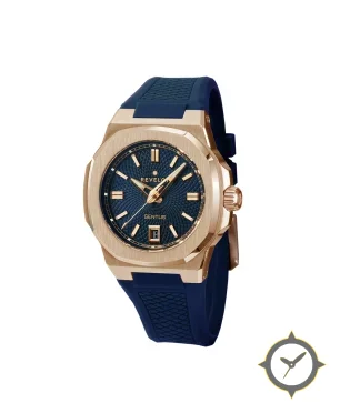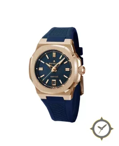 Eine Sport-Uhr mit einem 36mm Gehäuse im Vintage-Stil gefertigt aus Gold mit einem Zifferblatt in marineblau und einer besonderen "textured guilloché / waffle (hobnail)"-Oberfläche.