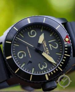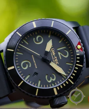 Eine Taucheruhr-Uhr mit einem markanten 44.5mm Auftritt am Handgelenk, gefertigt aus Edelstahl mit einem Zifferblatt in schwarz und einer besonderen "matte"-Oberfläche.