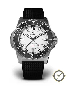Eine GMT-Uhr mit einem markanten 42.5mm Auftritt am Handgelenk, gefertigt aus Edelstahl mit einem Zifferblatt in weiß und einer besonderen "matte"-Oberfläche und einer echten GMT-Funktion, mit der du eine zweite Zeitzone verfolgen kannst.