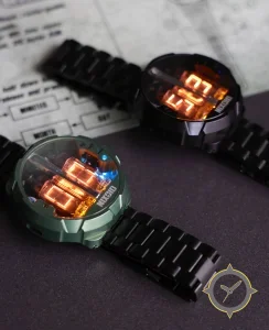 Eine Digital-Uhr gefertigt aus Beschichtung mit einem Zifferblatt in orange und einer besonderen "visible glowing nixie-style vacuum tubes"-Oberfläche.