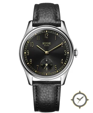 Eine Dress-Uhr mit einem 30.5mm Gehäuse im Vintage-Stil gefertigt aus Edelstahl mit einem Zifferblatt in schwarz und einer besonderen "sunburst"-Oberfläche.