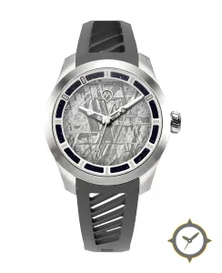 Eine Sport-Uhr mit einem vielseitigen 38mm Gehäuse, das an fast jedes Handgelenk passt, gefertigt aus Edelstahl mit einem Zifferblatt in grau und einer besonderen "meteorite-style textured / stone finish"-Oberfläche.
