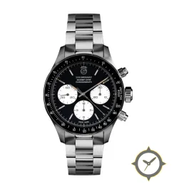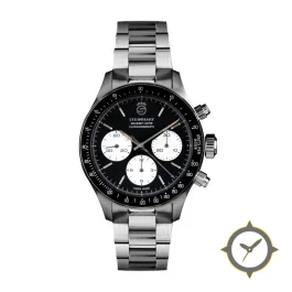 Eine Chronograph-Uhr mit einem markanten 44mm Auftritt am Handgelenk, gefertigt aus Edelstahl mit einem Zifferblatt in schwarz und einer besonderen "glossy"-Oberfläche.
