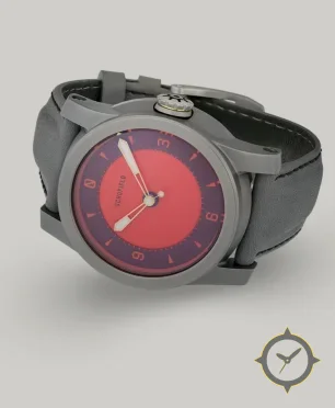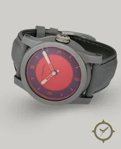 Eine Field-Uhr mit einem markanten 41.5mm Auftritt am Handgelenk, gefertigt aus Titan mit einem Zifferblatt in rot und einer besonderen "matte"-Oberfläche.