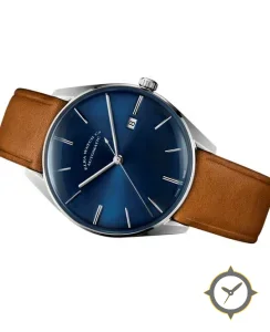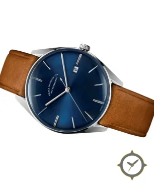 Eine Dress-Uhr mit einem 35mm Gehäuse im Vintage-Stil gefertigt aus Edelstahl mit einem Zifferblatt in blau und einer besonderen "sunburst"-Oberfläche.