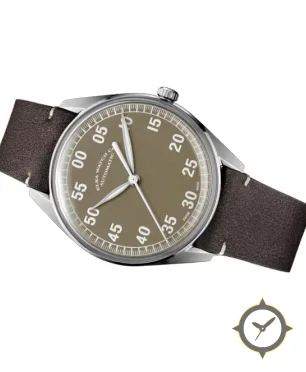 Eine Pilot-Uhr mit einem vielseitigen 38mm Gehäuse, das an fast jedes Handgelenk passt, gefertigt aus Edelstahl mit einem Zifferblatt in grün und einer besonderen "matte"-Oberfläche.