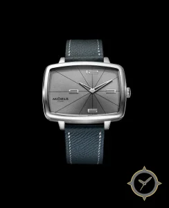 Eine Dress-Uhr mit einem 36.5mm Gehäuse im Vintage-Stil gefertigt aus Edelstahl mit einem Zifferblatt in grau und einer besonderen "sunburst with radial sector lines"-Oberfläche.