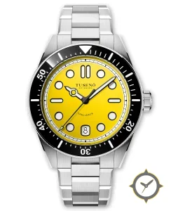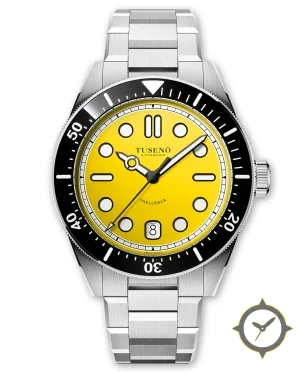 Eine Taucheruhr-Uhr mit einem markanten 42.5mm Auftritt am Handgelenk, gefertigt aus Edelstahl mit einem Zifferblatt in gelb und einer besonderen "glossy"-Oberfläche.