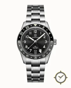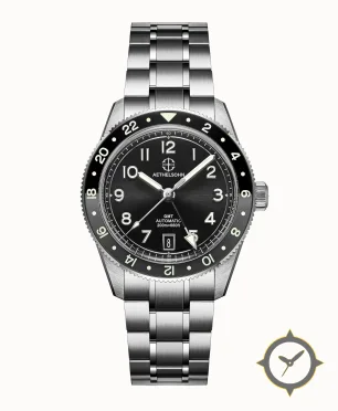 Eine GMT-Uhr mit einem vielseitigen 38.5mm Gehäuse, das an fast jedes Handgelenk passt, gefertigt aus Edelstahl mit einem Zifferblatt in schwarz und einer besonderen "sunburst"-Oberfläche und einer echten GMT-Funktion, mit der du eine zweite Zeitzone verfolgen kannst.