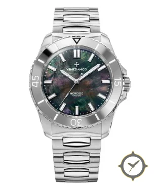 Eine Taucheruhr-Uhr mit einem markanten 42mm Auftritt am Handgelenk, gefertigt aus Edelstahl mit einem Zifferblatt in schwarz und einer besonderen "mother-of-pearl"-Oberfläche.