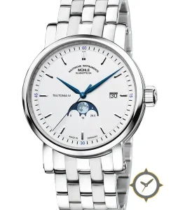 Eine Dress-Uhr mit einem markanten 44mm Auftritt am Handgelenk, gefertigt aus Edelstahl mit einem Zifferblatt in weiß und einer besonderen "lacquer"-Oberfläche und einer wunderschönen Mondphasenanzeige.