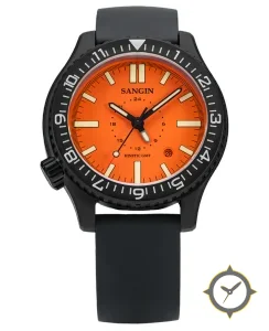 Eine -Uhr mit einem vielseitigen 38mm Gehäuse, das an fast jedes Handgelenk passt, gefertigt aus Edelstahl mit einem Zifferblatt in orange und einer besonderen "matte"-Oberfläche.