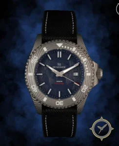 Eine Taucheruhr-Uhr mit einem 35mm Gehäuse im Vintage-Stil gefertigt aus Edelstahl mit einem Zifferblatt in blau und einer besonderen "textured, wave/guilloche pattern"-Oberfläche.