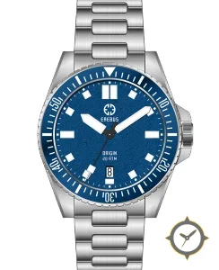 Eine Taucheruhr-Uhr mit einem vielseitigen 38.5mm Gehäuse, das an fast jedes Handgelenk passt, gefertigt aus Edelstahl mit einem Zifferblatt in blau und einer besonderen "textured"-Oberfläche.