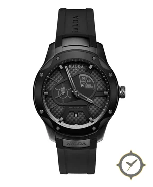 Eine Racing-Uhr mit einem markanten 43mm Auftritt am Handgelenk, gefertigt aus Edelstahl mit einem Zifferblatt in schwarz und einer besonderen "carbon fiber weave"-Oberfläche und einer praktischen Gangreserveanzeige.