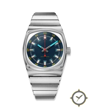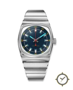 Eine Vintage-Uhr mit einem vielseitigen 40.5mm Gehäuse, das an fast jedes Handgelenk passt, gefertigt aus Edelstahl mit einem Zifferblatt in blau und einer besonderen "sunburst"-Oberfläche.