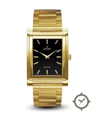 Eine Dress-Uhr mit einem 22.5mm Gehäuse im Vintage-Stil gefertigt aus Gold mit einem Zifferblatt in schwarz und einer besonderen "smooth"-Oberfläche.