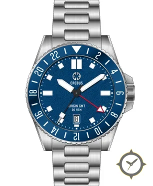 Eine GMT-Uhr mit einem markanten 45.5mm Auftritt am Handgelenk, gefertigt aus Edelstahl mit einem Zifferblatt in blau und einer besonderen "grained/textured"-Oberfläche und einer echten GMT-Funktion, mit der du eine zweite Zeitzone verfolgen kannst.