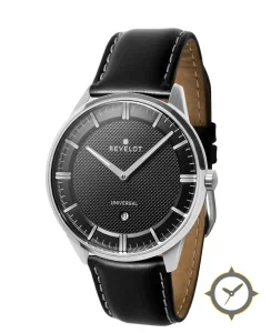 Eine Dress-Uhr mit einem 33.5mm Gehäuse im Vintage-Stil gefertigt aus Edelstahl mit einem Zifferblatt in schwarz und einer besonderen "waffle / clous-de-paris textured guilloché"-Oberfläche.