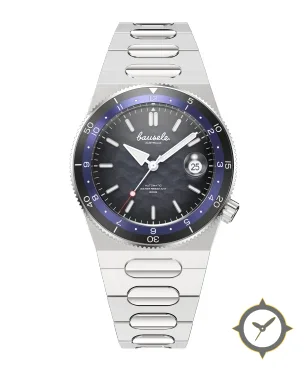 Eine Taucheruhr-Uhr mit einem markanten 43mm Auftritt am Handgelenk, gefertigt aus Edelstahl mit einem Zifferblatt in schwarz und einer besonderen "subtle wave / textured finish"-Oberfläche.