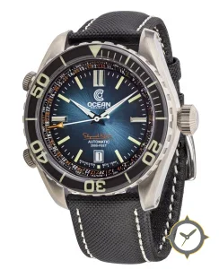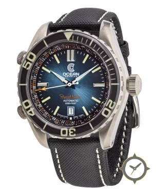 Eine Taucheruhr-Uhr mit einem markanten 52mm Auftritt am Handgelenk, gefertigt aus Edelstahl mit einem Zifferblatt in blau und einer besonderen "sunburst / radial brushing"-Oberfläche.